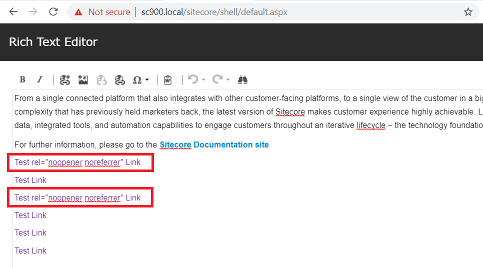 Sitecore 9.0 – Extra rel=”noopener noreferrer” substring is added to the markup when clicking Accept in Rich Text Editor