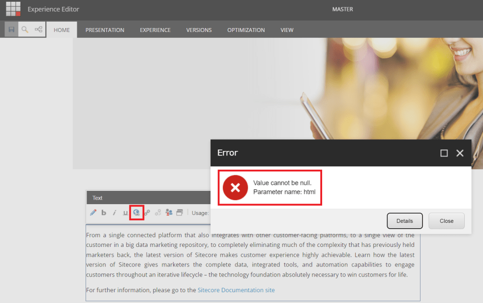 Sitecore 9.2 – “Value cannot be null – Parameter name: html” when inserting an external link into the text field through experience editor